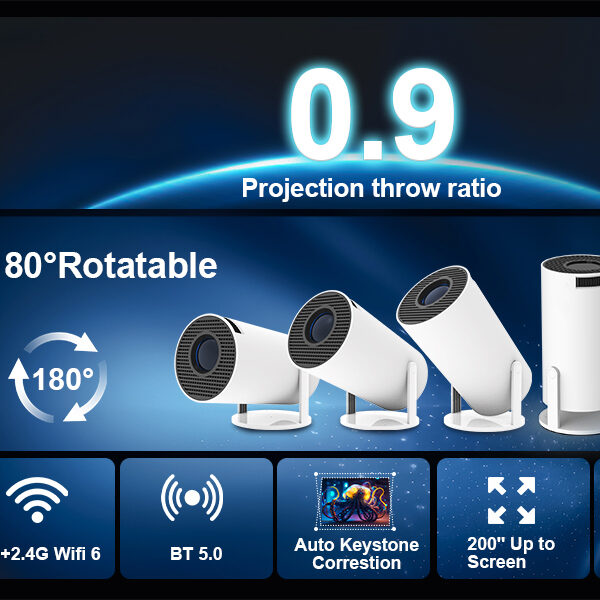 - The 180° rotatable design lets you project onto any surface — walls, ceilings or even flat floors — giving maximum flexibility for different viewing environments.
