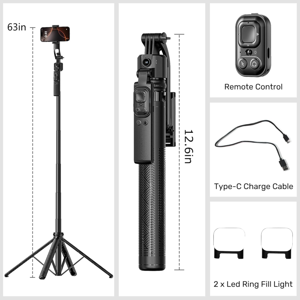 Use it as a tripod, selfie stick, or phone stand. The height and angle adjust so you can shoot at different perspectives.
